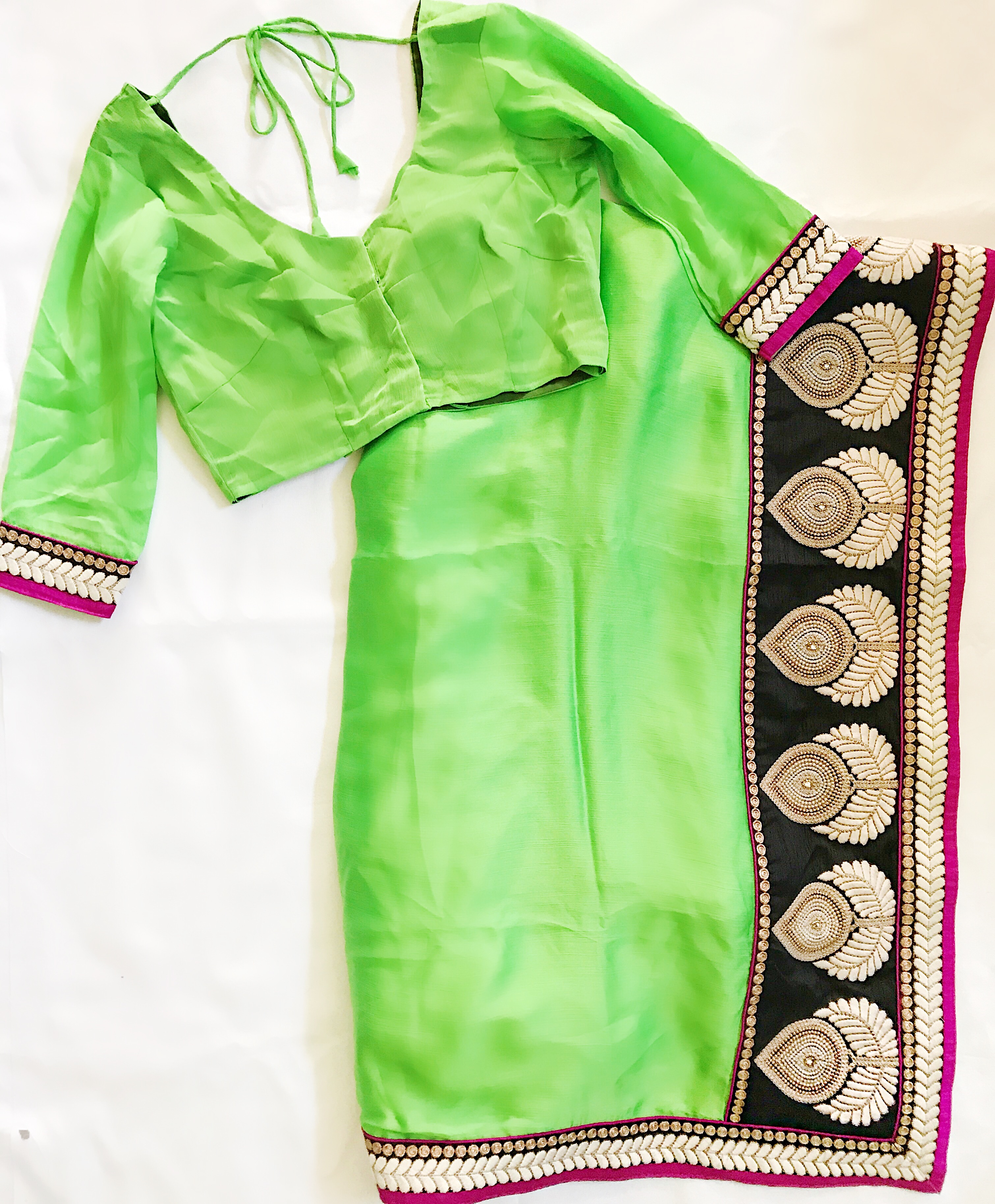 This chic lime green sari features a contrast threadwork border and comes with a matching blouse blouse. Gently used, excellent condition